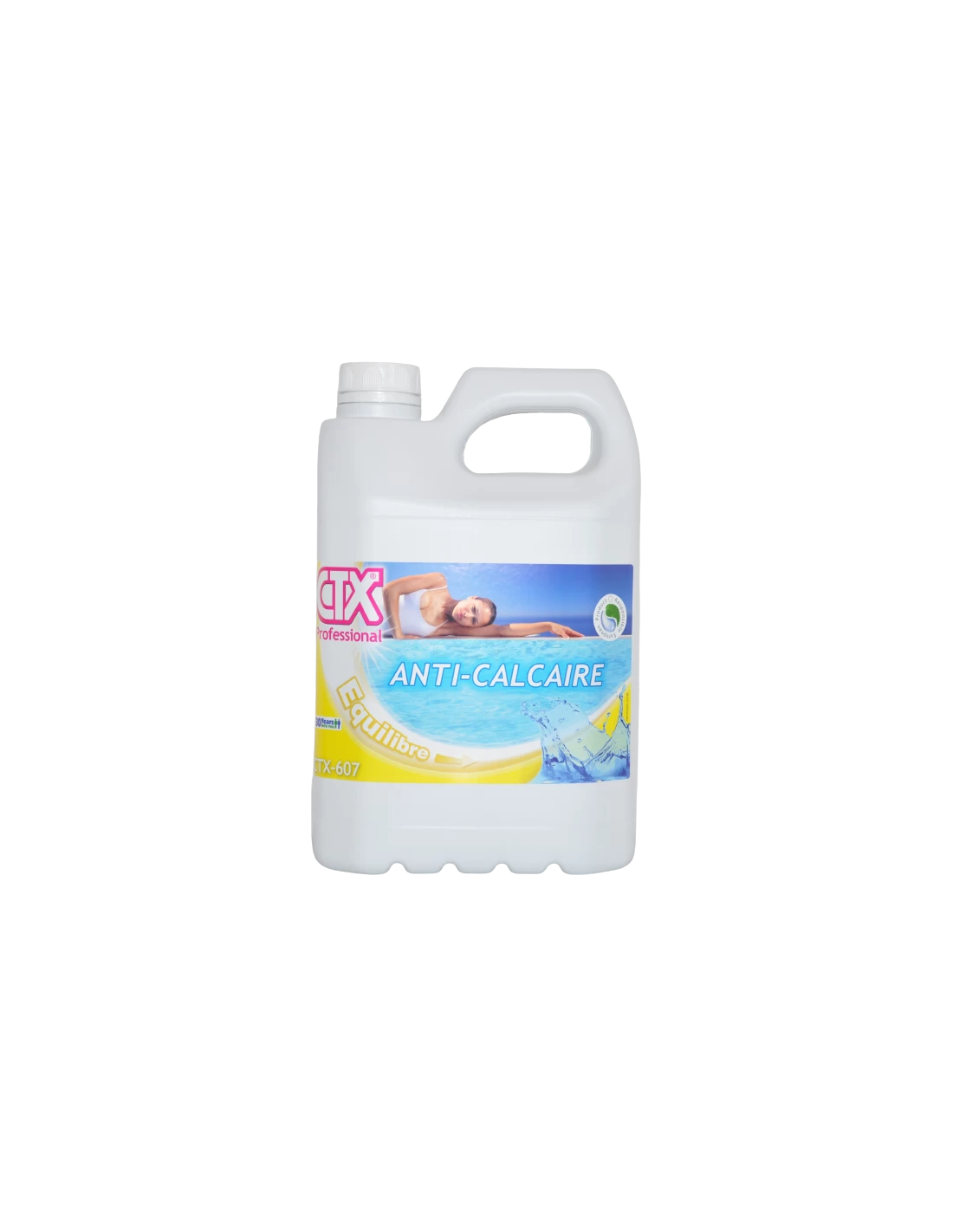 Évite les incrustations de calcaire dans le bassin et prévient les dépôts dans les tuyauteries. Conseils d’utilisation Diluer la quantité nécessaire de CTX-607 dans un récipient avec de l’eau et répartir la solution uniformément sur toute la surface de la piscine, filtration en marche. Si la piscine n’est pas vidée pour l’hiver, l’eau devra être traitée avec CTX-607 à la fin de la saison de baignade. (mettre la dose du traitement initial).